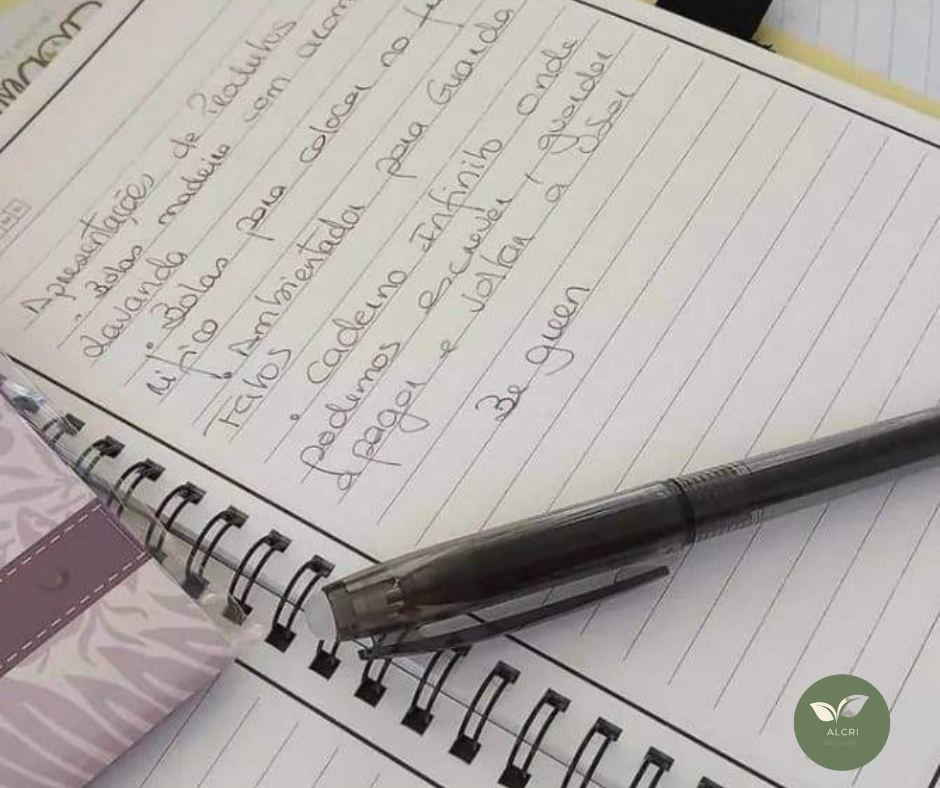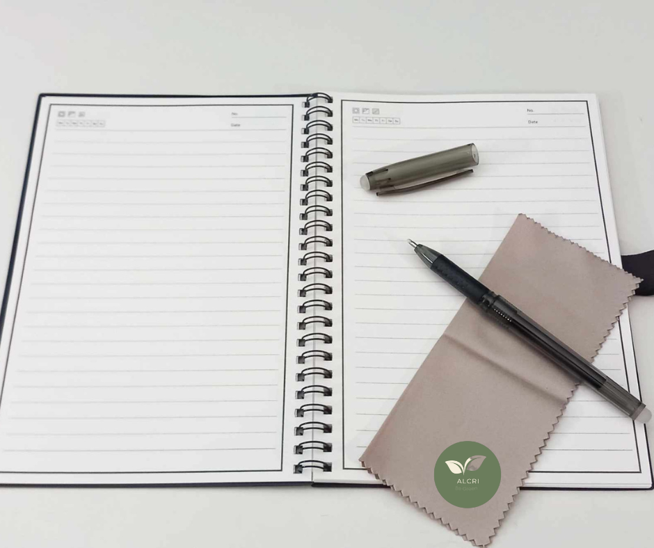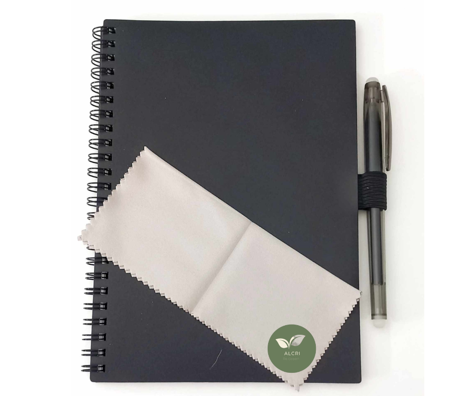 Caderno infinito A5 com esferográfica e pano de limpeza.